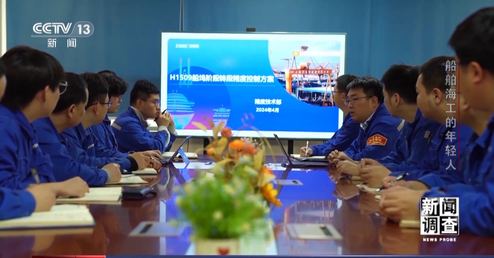 上海外高桥造船有限公司精度技术部副部长 孙建志:“爱达·魔都号”是我们国产首制的大型豪华邮轮,它的主体结构基本上16层甲板都是薄板结构,整体占比在70%以上,我们从造船业来讲,薄板的建造的工艺,一直是在船舶行业里比较难以突破的一个技术。