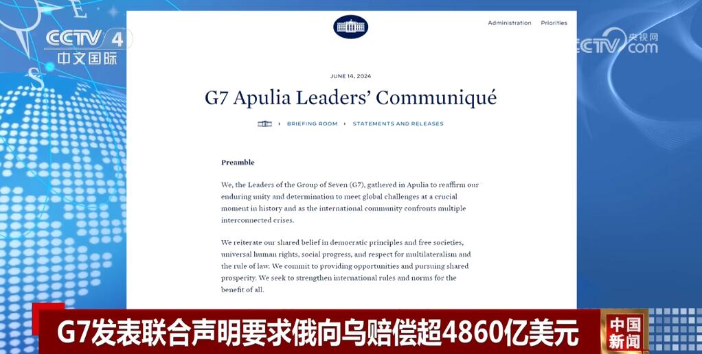 央视网消息:七国集团峰会6月13日至15日在意大利南部举行。据“今日俄罗斯”电视台等多家媒体报道,G7领导人14日发表联合声明,重申支持乌克兰,并要求俄罗斯向乌克兰赔偿超过4860亿美元的损失。