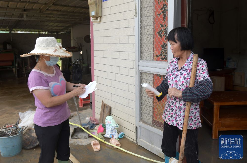 6月19日,在受灾严重的广东省梅州市平远县泗水镇大新村,工作人员向村民发放蜡烛。新华社记者 卢汉欣 摄