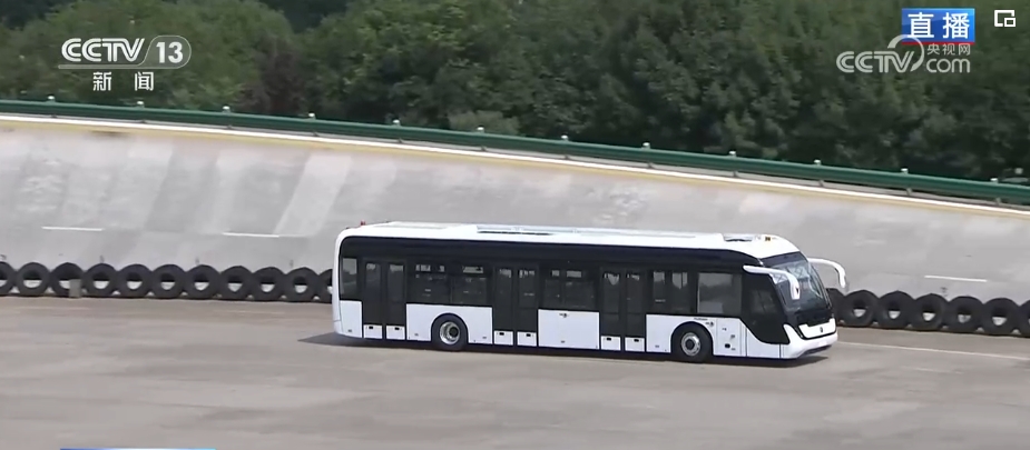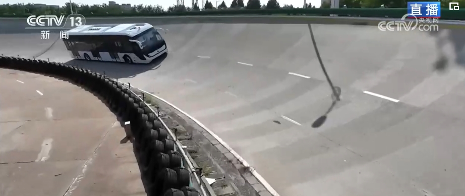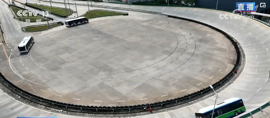 这个椭圆形的高环测试道上,46辆出口西班牙的纯电动机场摆渡车在进行45度环道离心力加速度测试。这样做的目的,是实现车辆高速转弯不降速,并且快速达到最高车速,保证车辆高速性能检测。