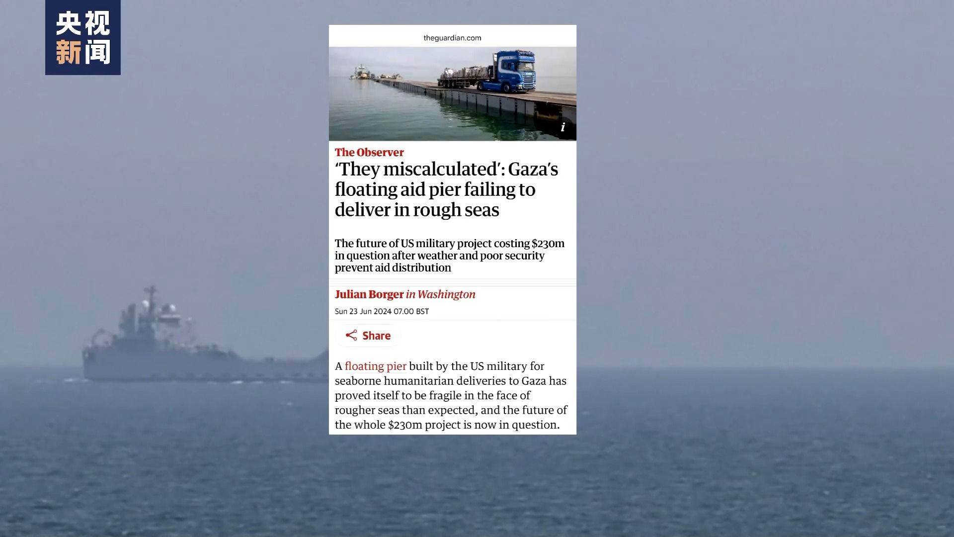 对此,英国《卫报》发文评价称,美军建造的临时码头在面对汹涌的海浪时显得十分脆弱,让人们对这个耗资巨大的码头能起到的援助效果产生怀疑。