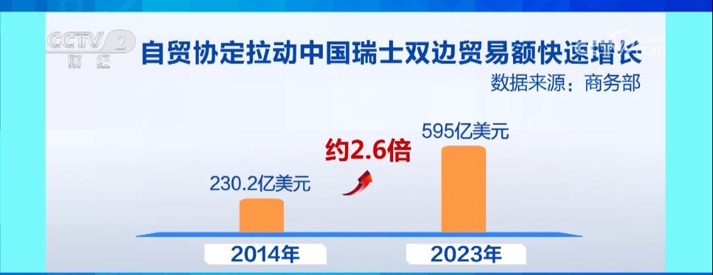 中国瑞士自贸协定是中国与欧洲国家签署的首个自贸协定。据统计,在自贸协定生效的2014年,中瑞双边贸易额为230.2亿美元;2023年,中瑞贸易额增至595亿美元,是2014年时的约2.6倍。此外,随着自贸协定整体利用率的提升,中瑞双向投资与技术合作不断加深。瑞士是中国在欧洲重要的技术引进来源国。同时,中国是瑞士全球第三大贸易伙伴。帕姆兰认为,瑞方高度重视中国不断高水平开放的巨大市场,高质量发展是双方的共同目标。