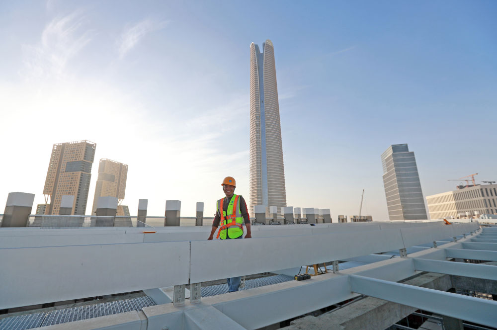 这是2023年11月22日在埃及开罗以东的埃及新行政首都中央商务区拍摄的一名在高楼楼顶施工的中国工人。新华社记者隋先凯摄