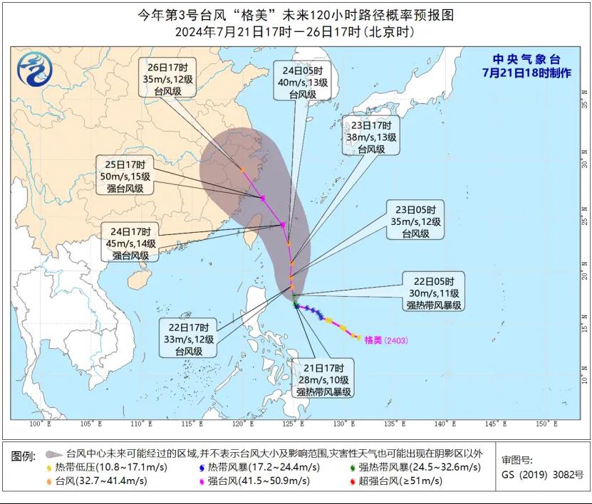 △今年第3号台风“格美”未来120小时路径概率预报图(7月21日17时—26日17时)