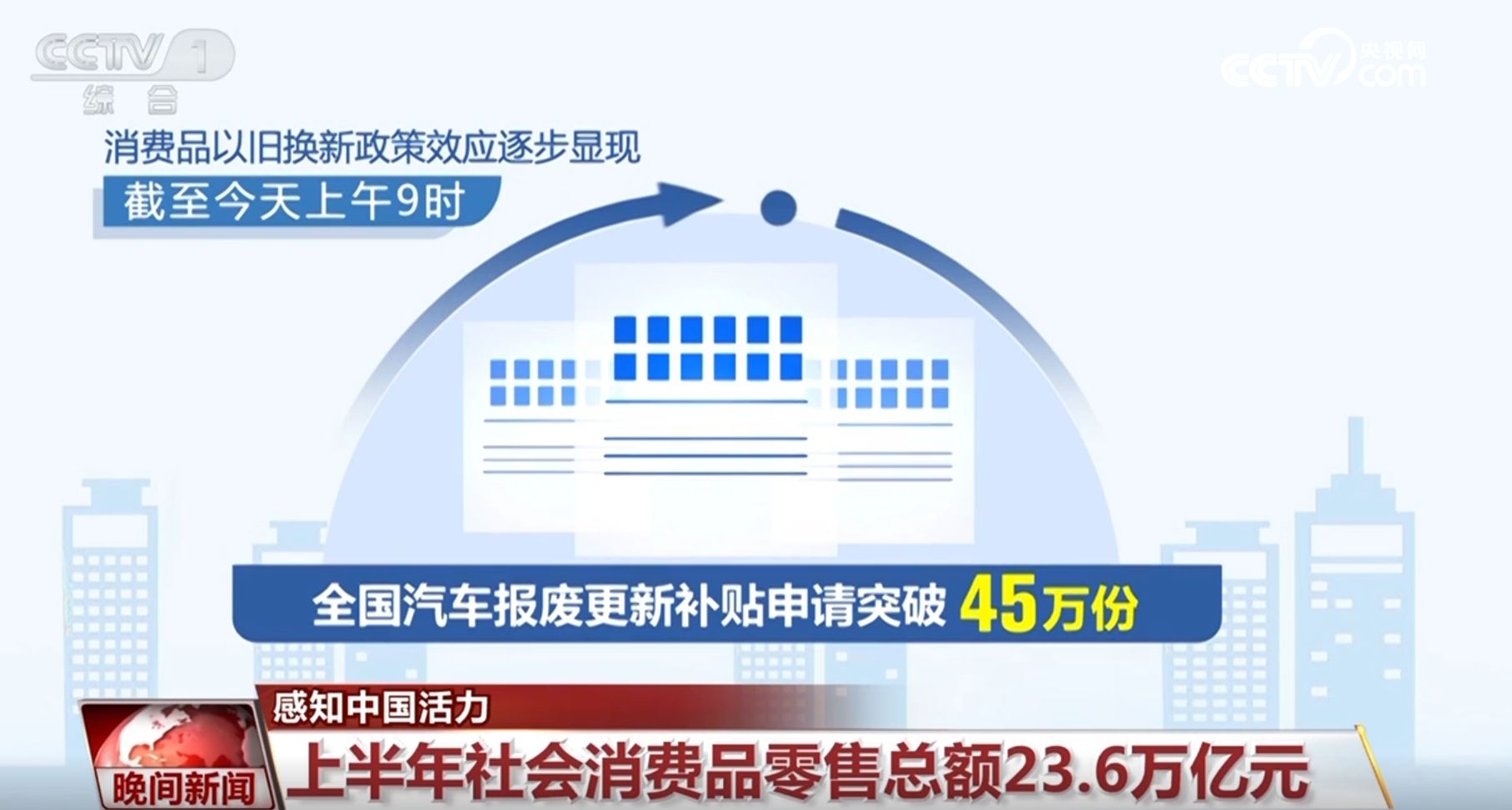 商务部公布的数据显示,今年以来,我国消费保持平稳增长,上半年社会消费品零售总额23.6万亿元,同比增长3.7%。消费品以旧换新政策效应逐步显现,截至8月2日9时,全国汽车报废更新补贴申请突破45万份,上半年新能源乘用车零售量增长33.1%。