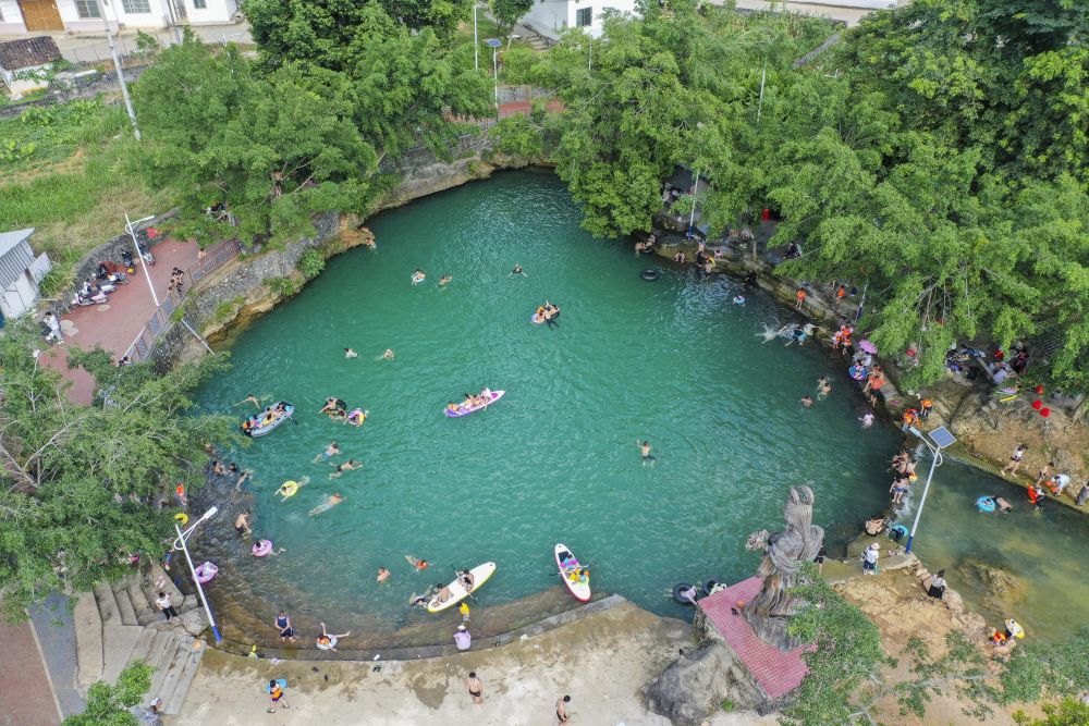 8月9日,游客在古零镇羊山村的一处泉水浴场玩耍。
