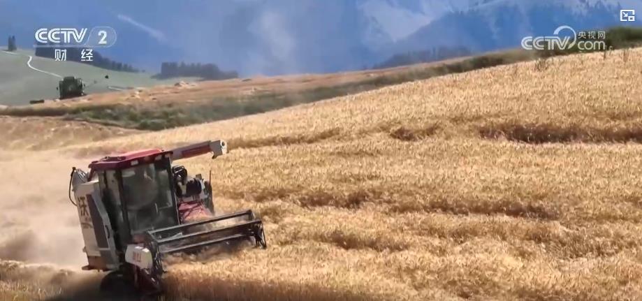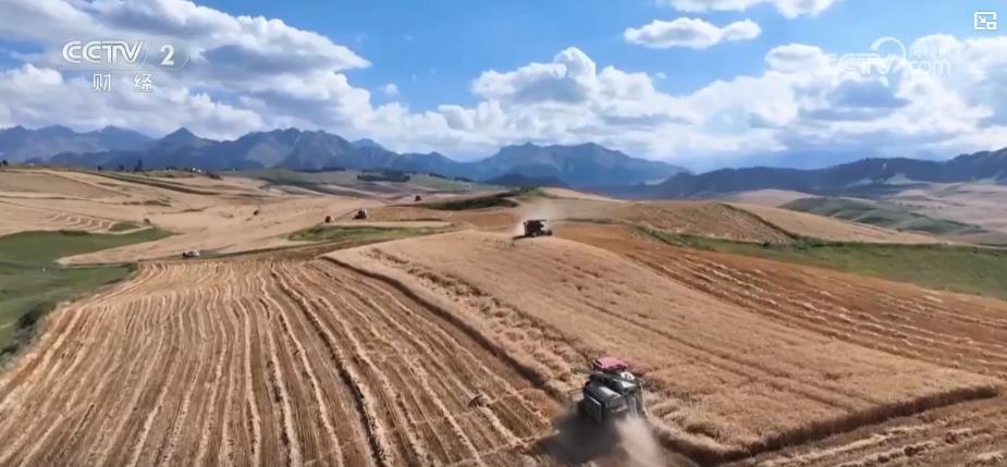 央视网消息:江布拉克的麦田主要分布在海拔1700米的平缓丘陵地带,麦田随山势连绵起伏。这里的机械化收割作业使用的大多是中小型的轮式或者是履带式的收割机,预计8月底、9月初左右基本能完成小麦的收割。