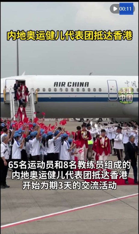 上午11点56分,代表团乘坐的专机停靠在香港国际机场,香港特区政府早早在停机坪铺下红毯,100多名由青少年组成的欢迎队伍挥舞着五星红旗和香港特区区旗等候代表团的到来。