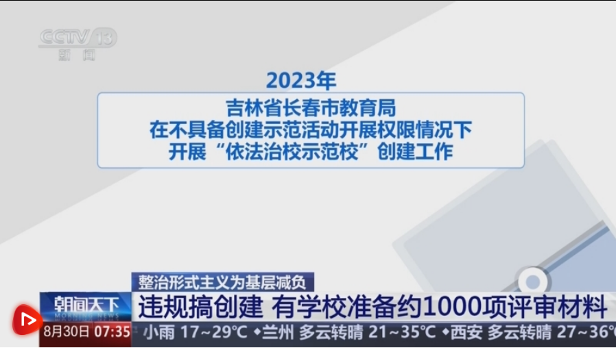 2023年,吉林省长春市教育局在不具备创建示范活动开展权限情况下,开展“依法治校示范校”创建工作,并将上级单位“两年一创建”的频次加码为“一年一创建”,将上级单位下发的98项评价指标层层分解为179项打分标准,导致有的申报学校准备了约1000项评审材料,给基层学校增加负担。2024年3月,在中央已部署创建示范活动清理优化工作后,长春市教育局仍未及时叫停“依法治校示范校”创建工作。