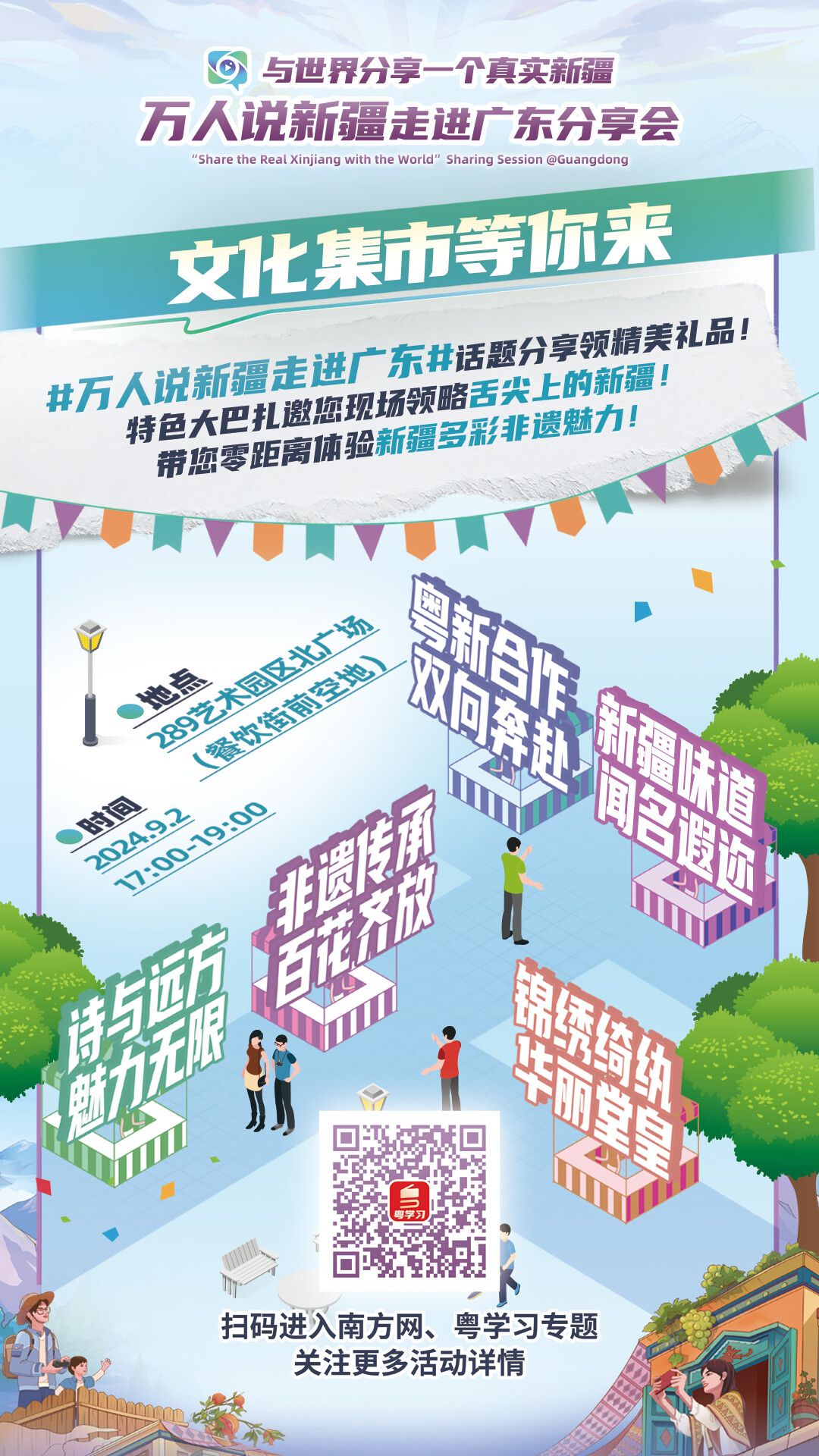 在交流互鉴中把新疆温柔地说与全世界,在新粤两地合作中感悟跨“粤”千里的援疆故事。“万人说新疆”走进广东分享会将于9月2日至3日在广州举行。此次活动由新疆维吾尔自治区党委网信办主办,广东省委网信办、广东省对口支援新疆工作前方指挥部协办,南方新闻网承办。分享会从国内知名学者、外籍专家、海内外博主、援疆干部、港澳青年等不同视角,讲述有温度、有情怀、接地气的美好新疆故事。