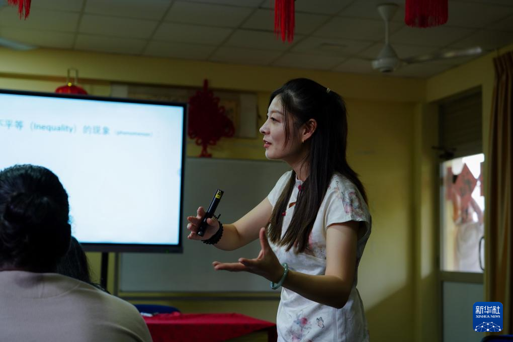 4月3日,在位于斯里兰卡中央山脉南麓的萨伯勒格穆沃大学,萨伯勒格穆沃大学孔子课堂院长朱颂(左)在“国际中文日”活动上与学校教职工汉语培训班的学员互动。新华社发(萨伯勒格穆沃大学孔子课堂供图)