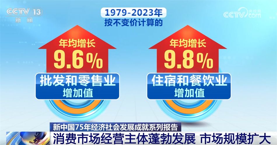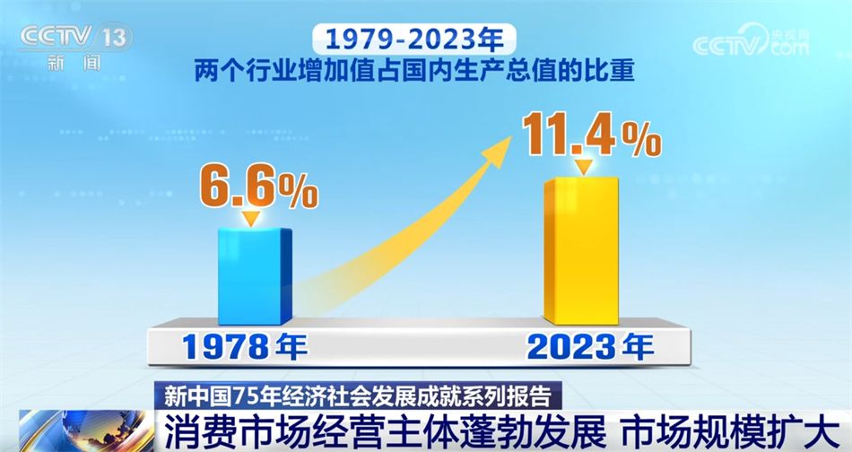 经济发展方式优化转变,与消费紧密相关的批发和零售业、住宿和餐饮业对经济增长的贡献作用明显增强。1979—2023年,按不变价计算的批发和零售业、住宿和餐饮业增加值年均分别增长9.6%、9.8%,两个行业增加值占国内生产总值的比重由1978年的6.6%提升至2023年的11.4%。