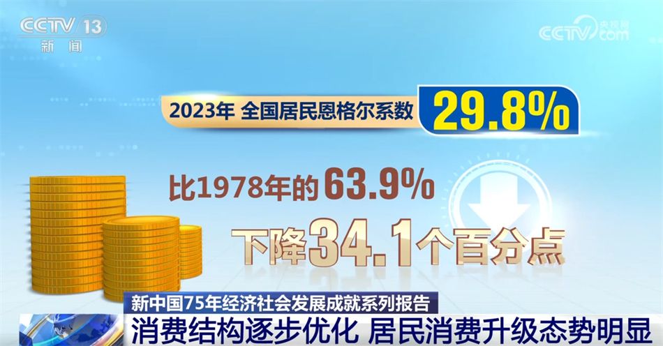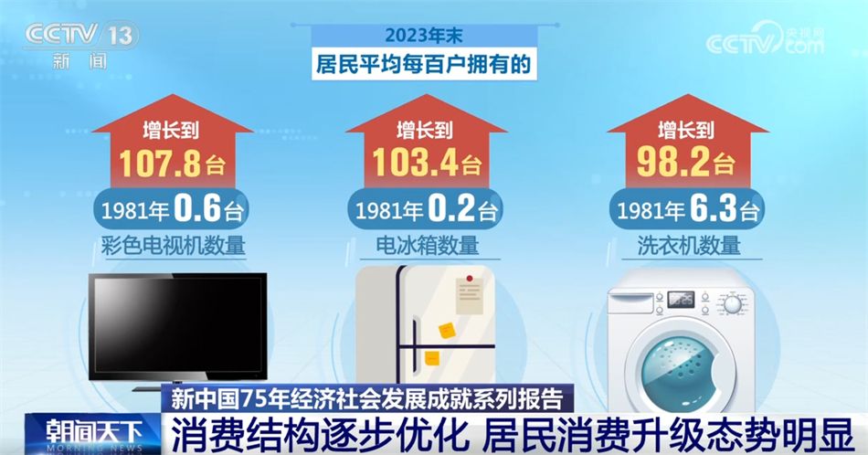 新中国成立75年来,我国商品结构持续优化调整,2023年,全国居民恩格尔系数为29.8%,比1978年的63.9%下降34.1个百分点,粮油、服装、日用品等商品消费占比明显降低。家电等耐用品消费较快增长,2023年末,居民平均每百户拥有的彩色电视机、电冰箱、洗衣机数量由1981年的0.6台、0.2台和6.3台增长到107.8台、103.4台和98.2台。