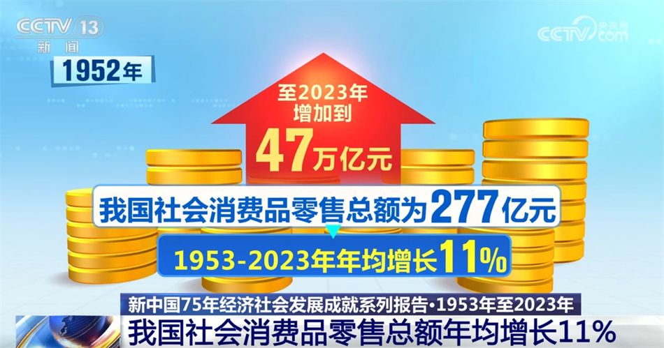 市场规模持续扩大,1952年,我国社会消费品零售总额为277亿元,至2023年增加到47万亿元,1953—2023年年均增长11%,成为全球第二大消费市场。
