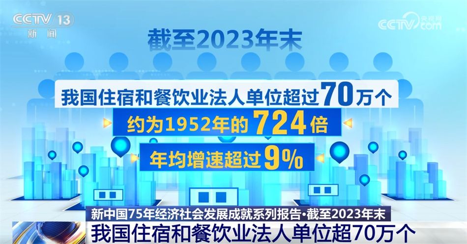 新中国成立75年来,我国商贸流通行业单位数量快速增长,截至2023年末,我国批发和零售业法人单位超过1000万个,约为1952年的77倍,1953—2023 年年均增速超过6%;住宿和餐饮业法人单位超过70万个,约为1952年的724倍,年均增速超过9%。