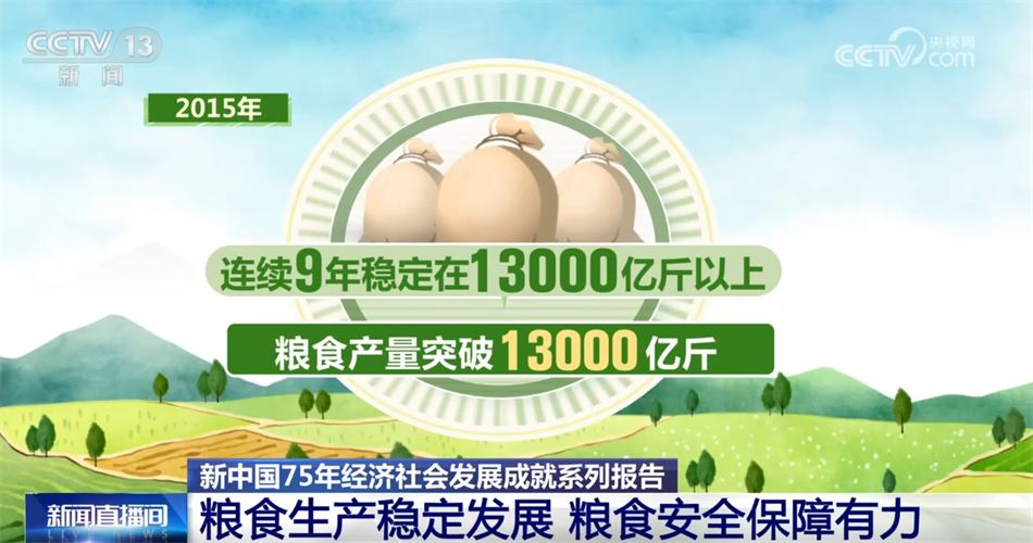 新中国成立初期,我国粮食产量仅2000多亿斤。改革开放以来,随着家庭联产承包责任制的建立实施,粮食产量接连跨上新台阶。党的十八大以来,通过深入实施“藏粮于地、藏粮于技”战略,我国粮食综合生产能力稳步提升,粮食生产开创新局面。2015年粮食产量突破13000亿斤,此后连续9年稳定在13000亿斤以上。2023年粮食产量达到13908亿斤,比1949年增长5.1倍;人均粮食产量493公斤,连续多年超出世界平均水平,也高于国际公认的400公斤粮食安全线。