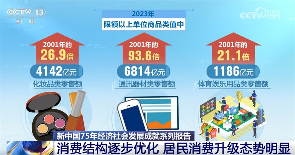 新中国75年经济社会发展成就系列报告还指出,新中国成立75年以来,我国居民消费从注重量的满足逐步转向追求质的提升,消费需求日益多元,消费升级态势日趋明显。