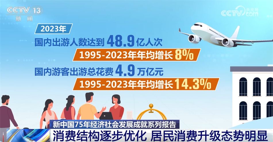 消费需求向多元化拓展,旅游消费、文化娱乐消费需求旺盛。2023年,国内出游人数达到48.9亿人次,1995—2023年年均增长8%;国内游客出游总花费4.9万亿元,1995—2023年年均增长14.3%。2023年,全国电影票房收入549亿元,比1991年增长20倍以上,其中,国产影片票房收入460亿元、市场份额达到80%以上。