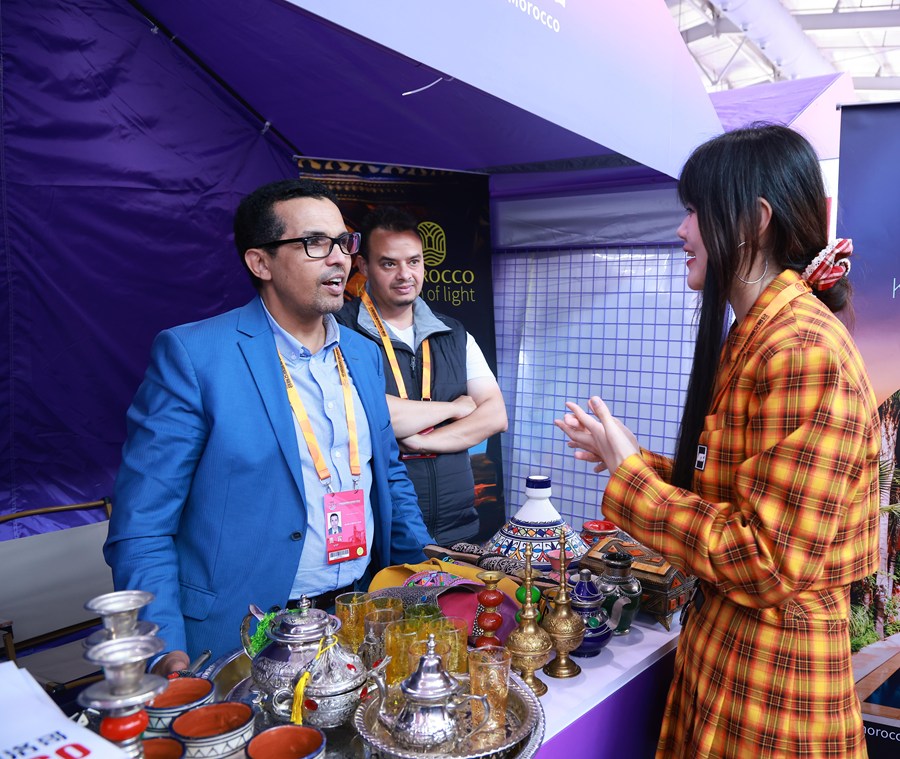 9月14日,“炫彩世界”活动进入展期第3天,游客热情依旧。在摩洛哥王国驻华大使馆展台,摩洛哥驻华公使穆雷•穆萨维向各国游客热情地介绍装饰有独特花纹的茶具摆件和收纳盘。