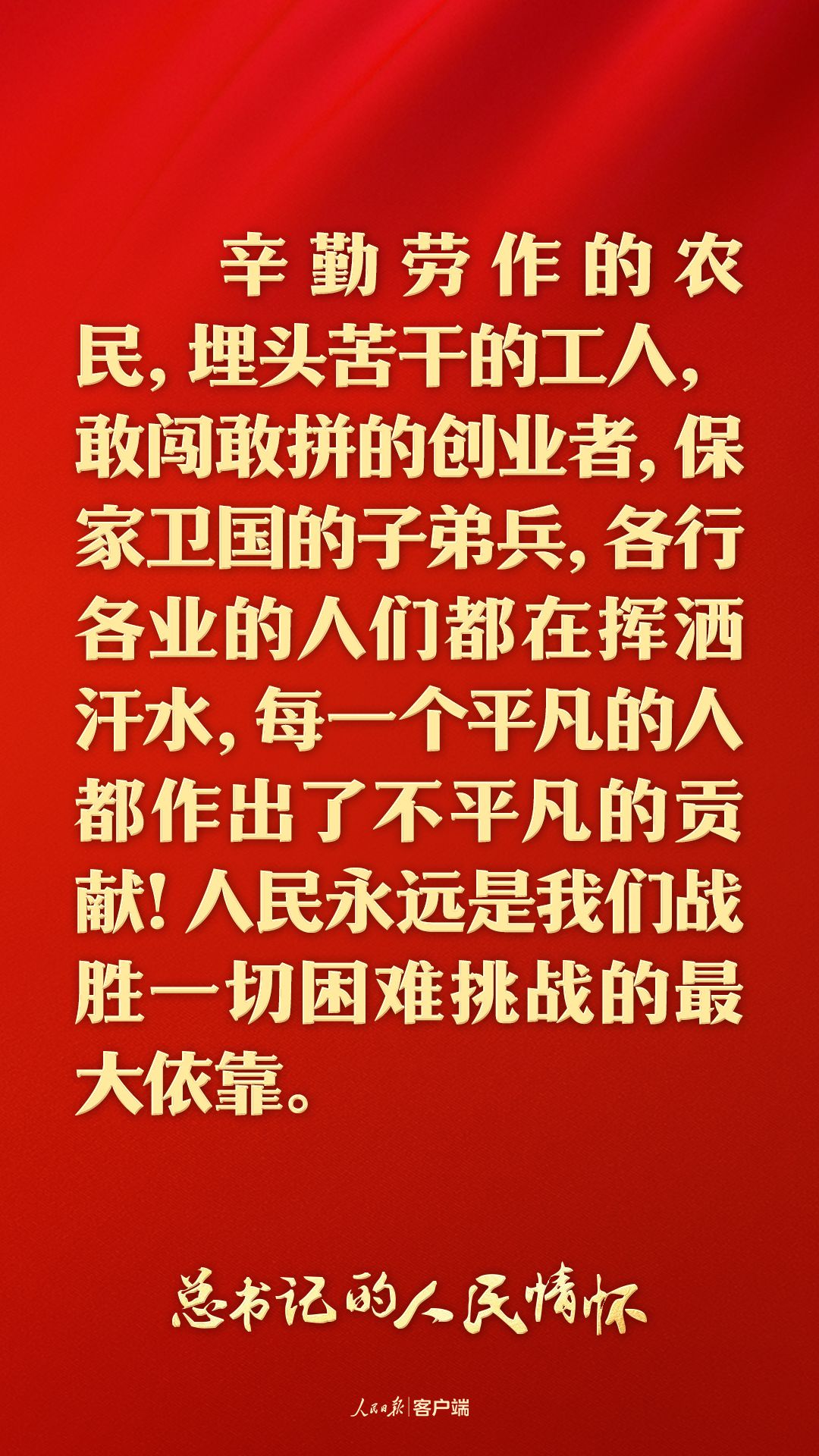 人民,在习近平总书记心目中位置最高、分量最重。“人民永远是我们战胜一切困难挑战的最大依靠”“千千万万普通人最伟大”。