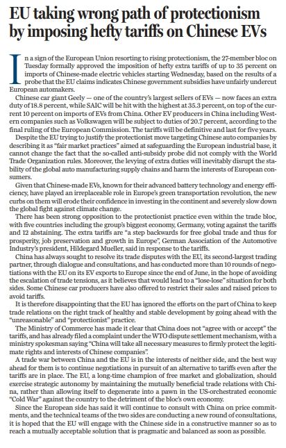 原标题:EU taking wrong path of protectionism by imposing hefty tariffs on Chinese EVs