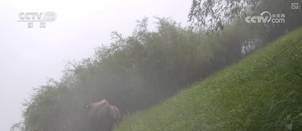 多头贡山羚牛现身森林 躲雨觅食