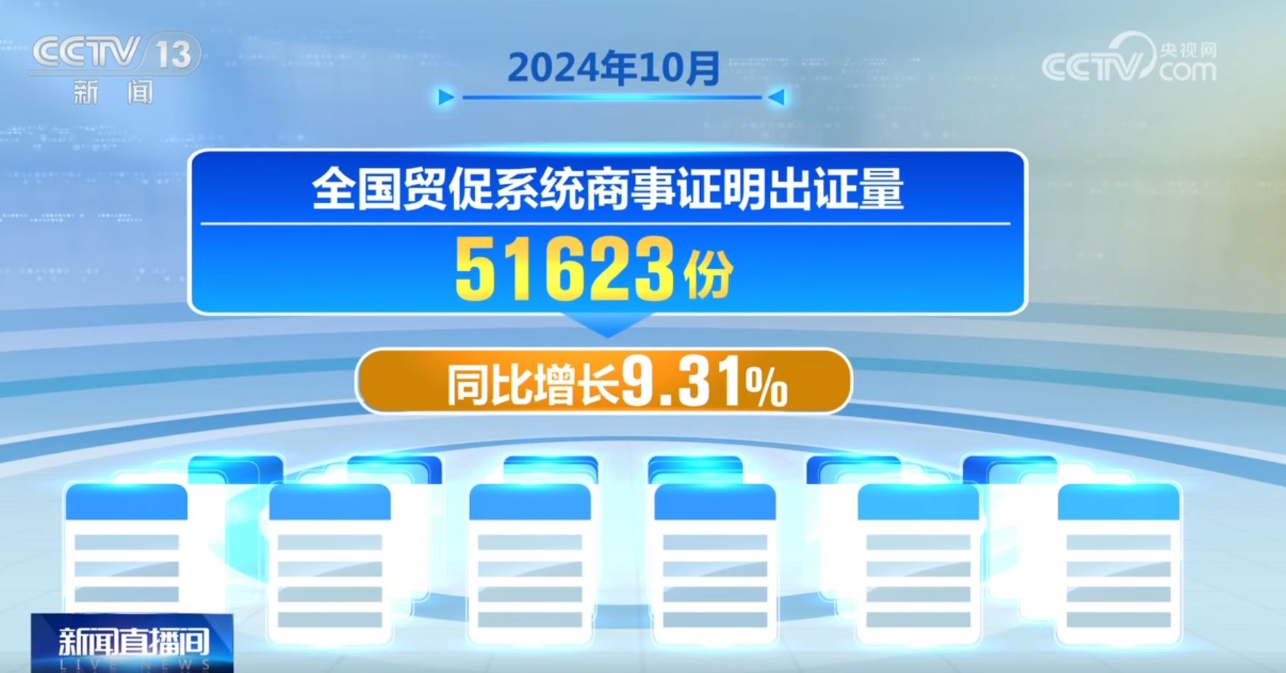 央视网消息:中国贸促会11月22日上午举行新闻发布会介绍,今年10月,全国贸促系统累计签发各类商事证书较上年同比增长20.41%。商事证书是外贸出口的晴雨表,签发数量增长反映了在一揽子增量政策集中发力背景下,我国外贸平稳增长,规模持续扩大,结构不断优化。