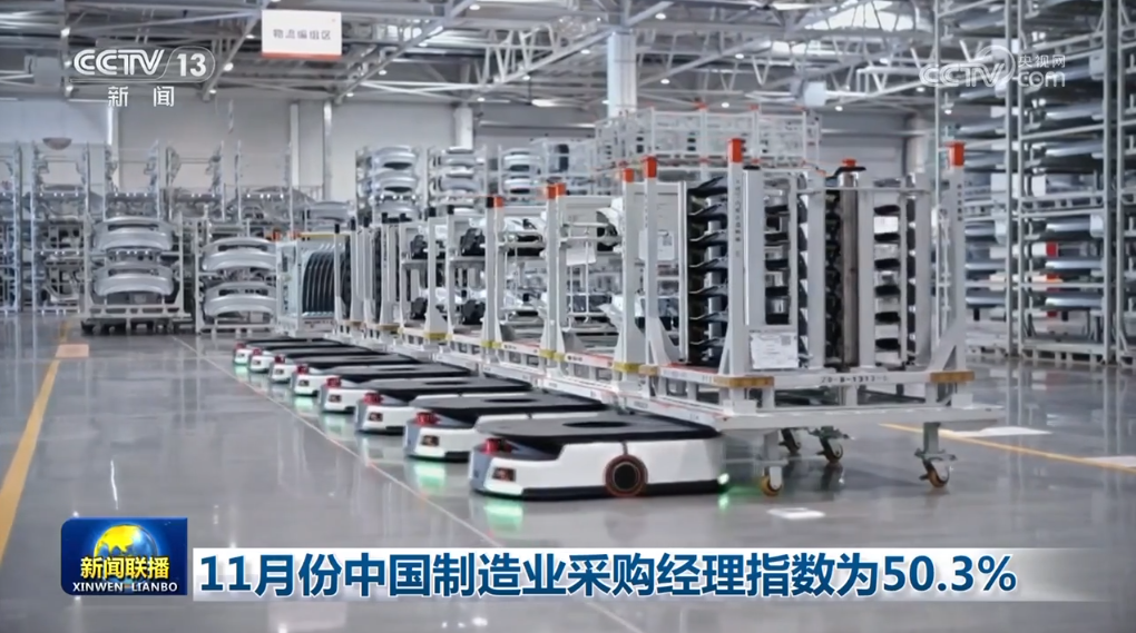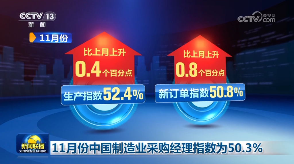 央视网消息:中国物流与采购联合会、国家统计局11月30日公布11月份中国制造业采购经理指数。随着一系列存量政策和增量政策持续协同发力,制造业采购经理指数扩张步伐有所加快,我国经济景气水平总体保持稳定扩张。