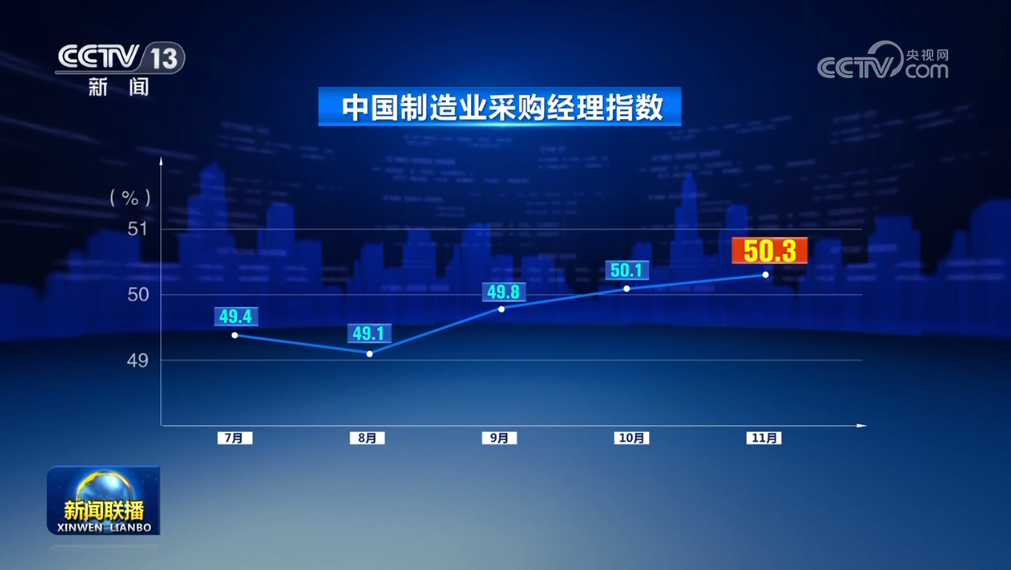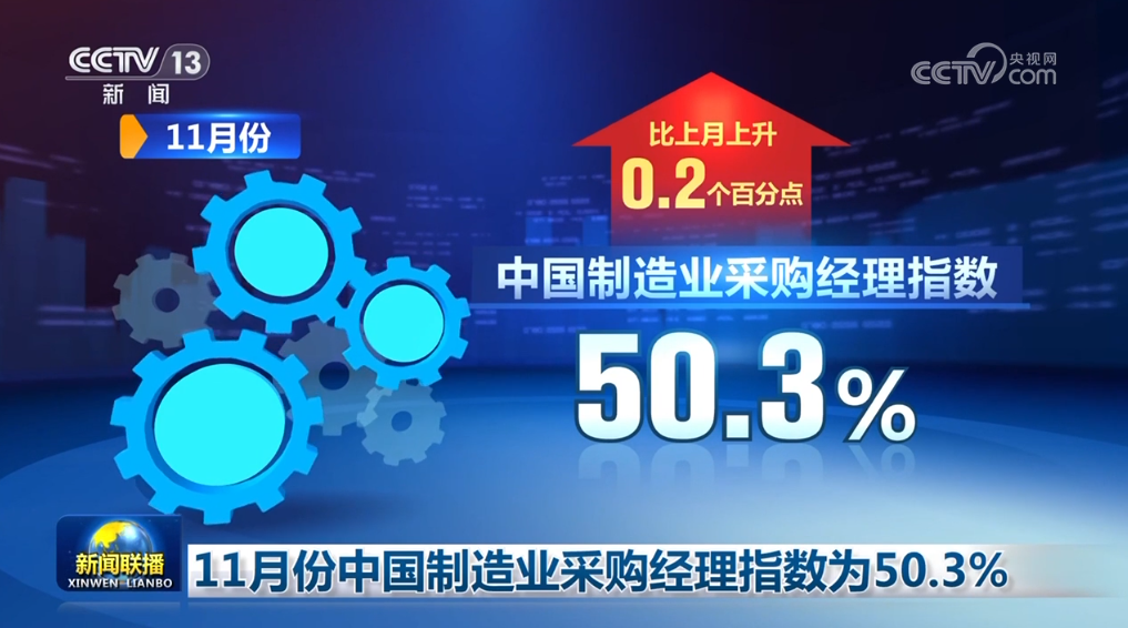 11月份中国制造业采购经理指数为50.3%,比上月上升0.2个百分点。