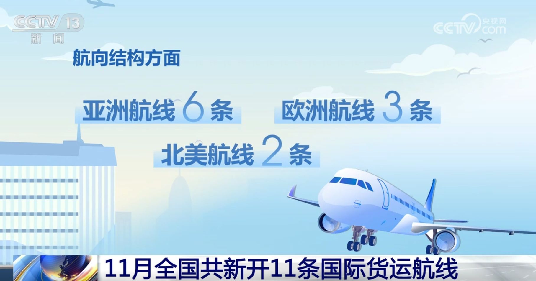 据介绍,11月份全国共新开11条国际货运航线,每周增加超过30个往返航班。航向结构方面,亚洲航线6条,欧洲航线3条,北美航线2条。