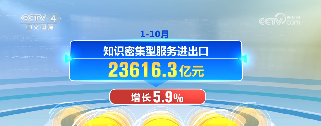 央视网消息:中国商务部最新发布的数据显示,今年1至10月,中国服务贸易继续快速增长,服务进出口总额同比增长14.6%。
