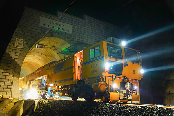 人民网曼谷12月7日电(记者孙广勇、通讯员周星)凌晨1时10分,在位于老挝琅勃拉邦地区的中老铁路磨(丁)万(象)段沙嫩山2号中桥上,一辆黄色接触网轨道车缓慢移动,明亮的灯光刺破黑夜。
