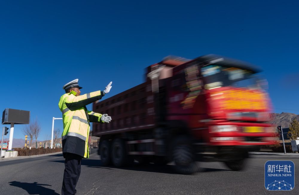 1月10日,在日喀则市区,交警加措在指挥交通,让完成救灾物资运输任务的救援车辆顺利出城。新华社记者 丁增尼达 摄