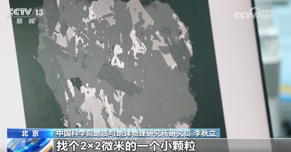 李秋立称:“我们要在里边首先找到记录时间的小矿物,找出来之后变成离子激发出来,它这里边哪儿是定年矿物呢?要把它放到最小的这一颗白点,是定年矿物。那么这颗岩屑的实物有多大?大概800微米,在这个800×800微米里边找个2×2微米的一个小颗粒,在这么小的范围可以激发它的,目前只有离子探针这个技术,我们进行了长期训练,可以把它做到更小的范围内测得更准的数据。”