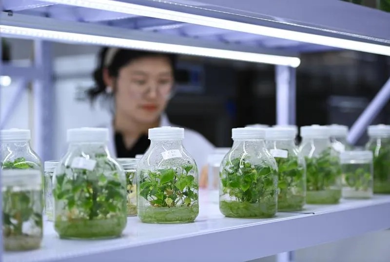 图为2024年12月2日,工作人员在谢径安传化植物科学中心观察育种情况。新华社记者 卢哲/摄