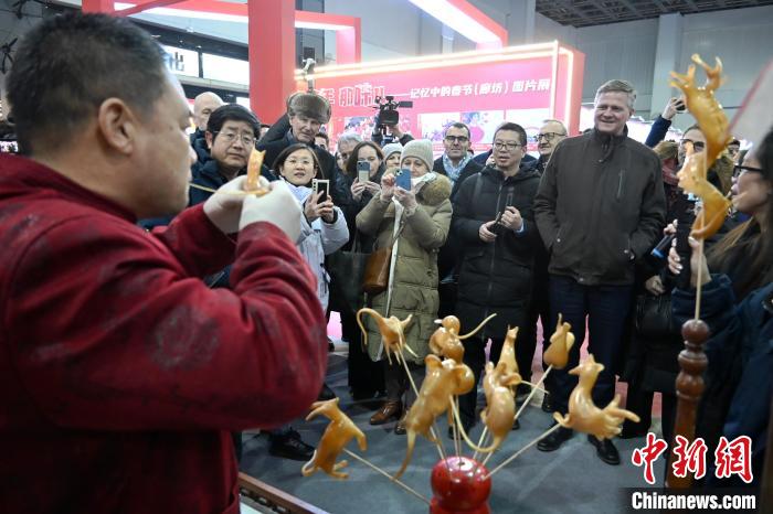 2月7日,多位驻华使节在廊坊国际年货节上被吹糖人技艺吸引。 中新社记者 翟羽佳 摄