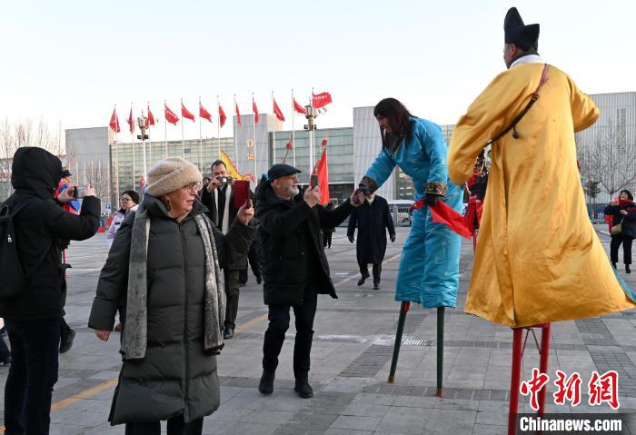 2月7日,驻华使节团成员与踩高跷表演者交流。 中新社记者 翟羽佳 摄