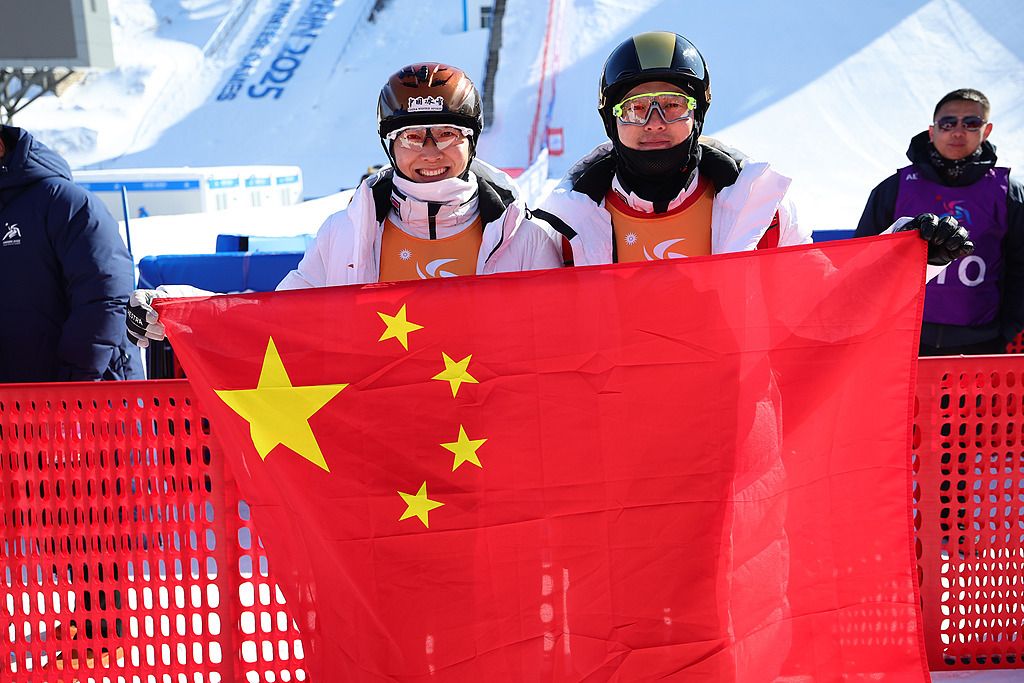 △2025年2月10日,哈尔滨亚冬会自由式滑雪空中技巧混合团体决赛,徐梦桃(左)和齐广璞(右)庆祝夺冠。