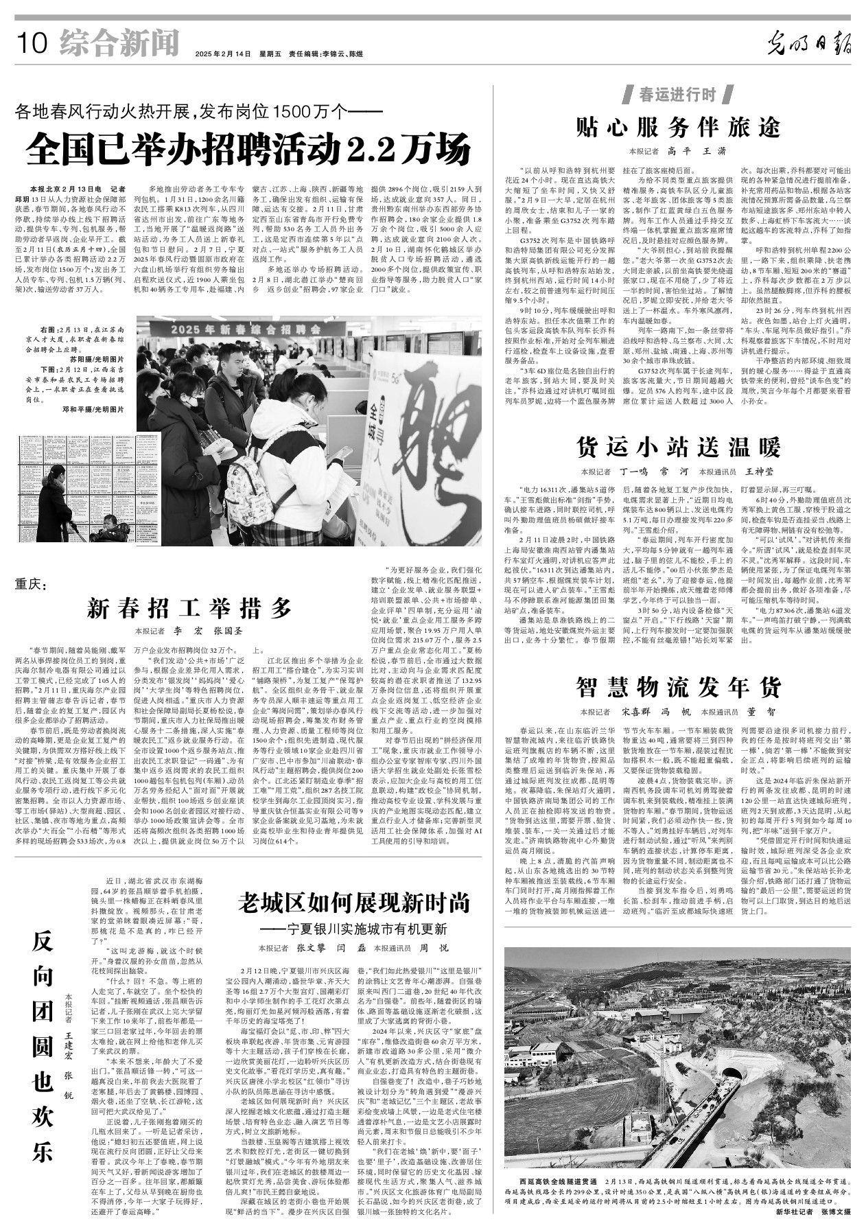 “我们发动‘公共+市场’广泛参与,根据企业差异化用人需求,分类发布‘银发岗’‘妈妈岗’‘爱心岗’‘大学生岗’等特色招聘岗位,促进人岗相适。”重庆市人力资源和社会保障局副局长夏杨松说,春节期间,重庆市人力社保局推出暖心服务十二条措施,深入实施“春暖农民工”返乡就业服务行动。在全市设置1000个返乡服务站点、推出农民工求职登记“一码通”、为有集中返乡返岗需求的农民工组织1000趟包车包机包列(车厢)、动员万名劳务经纪人“面对面”开展就业帮扶,组织100场返乡创业座谈会和1000名创业者园区对接行动、举办1000场政策宣讲会等。全市还将高频次组织各类招聘1000场次以上,提供就业岗位50万个以上。