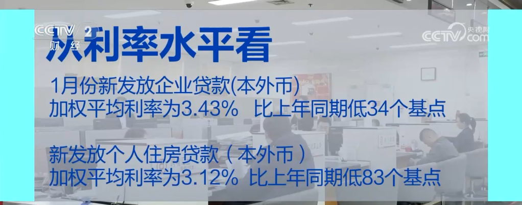 从利率水平看,贷款利率继续保持在历史低位。1月份,新发放企业贷款(本外币)加权平均利率为3.43%,比上年同期低34个基点;新发放个人住房贷款(本外币)加权平均利率为3.12%,比上年同期低83个基点。