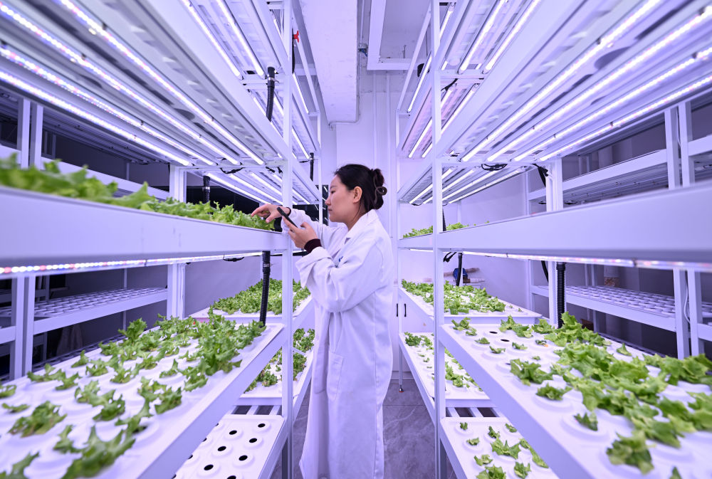 科芯(天津)生态农业科技有限公司工作人员在实验室查看农作物生长情况。 新华社记者 赵子硕 摄