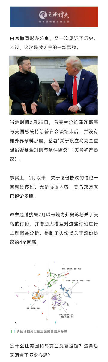 #四个镜头看美乌为何谈崩# 白宫椭圆形办公室,又一次见证了历史。不过,这次是破天荒的一场骂战——就美乌矿产协议,美国和乌克兰谈崩了,甚至连泽连斯基都被要求提前离开白宫。谭主注意到,大家的关注点集中在这四个问题:协议具体说了什么、协议具体怎么执行、协议到底涉及多少钱、协议能促成和平吗。回答了这四个问题,也就理解美乌为何会不欢而散。