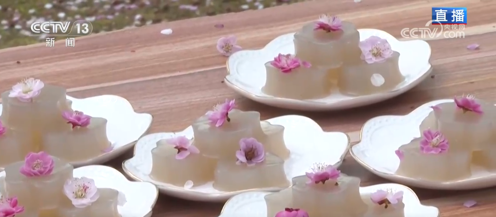 这个季节来到芳院村,与赏花踏青最搭配的就是围炉煮茶了。芳院村的茶也非常特别,叫做“蛋茶”。就把煮开的茶水冲入均匀搅拌的蛋液中,然后再加上冰糖,这就是“蛋茶”。每当村里谁家办大事、干重活的时候,村民们都会泡蛋茶来接待,这也是当地的待客首礼。在芳院村,这个季节还有一个春日限定美食,就是梅花糕。它主要的原材料是当地的地瓜粉,关键在于用了梅花花瓣熬出来的汁。梅花糕不仅形似梅花,而且入口甜糯、味道清雅,这些也是芳院村正在打造的“花样”经济。近年来,当地在保护传统村落的基础上,以花为“媒”培育“花样”经济,吸引游客前来赏花打卡,带动村集体和村民双增收。