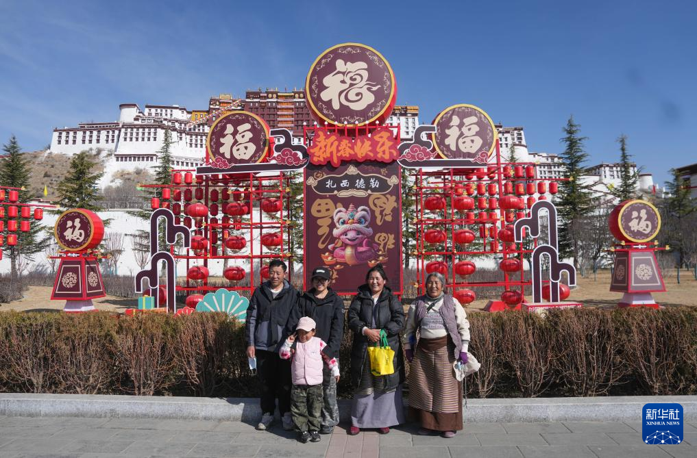 2月28日,来自西藏那曲市比如县的一家人在拉萨布达拉宫前合影留念。新华社记者 晋美多吉 摄