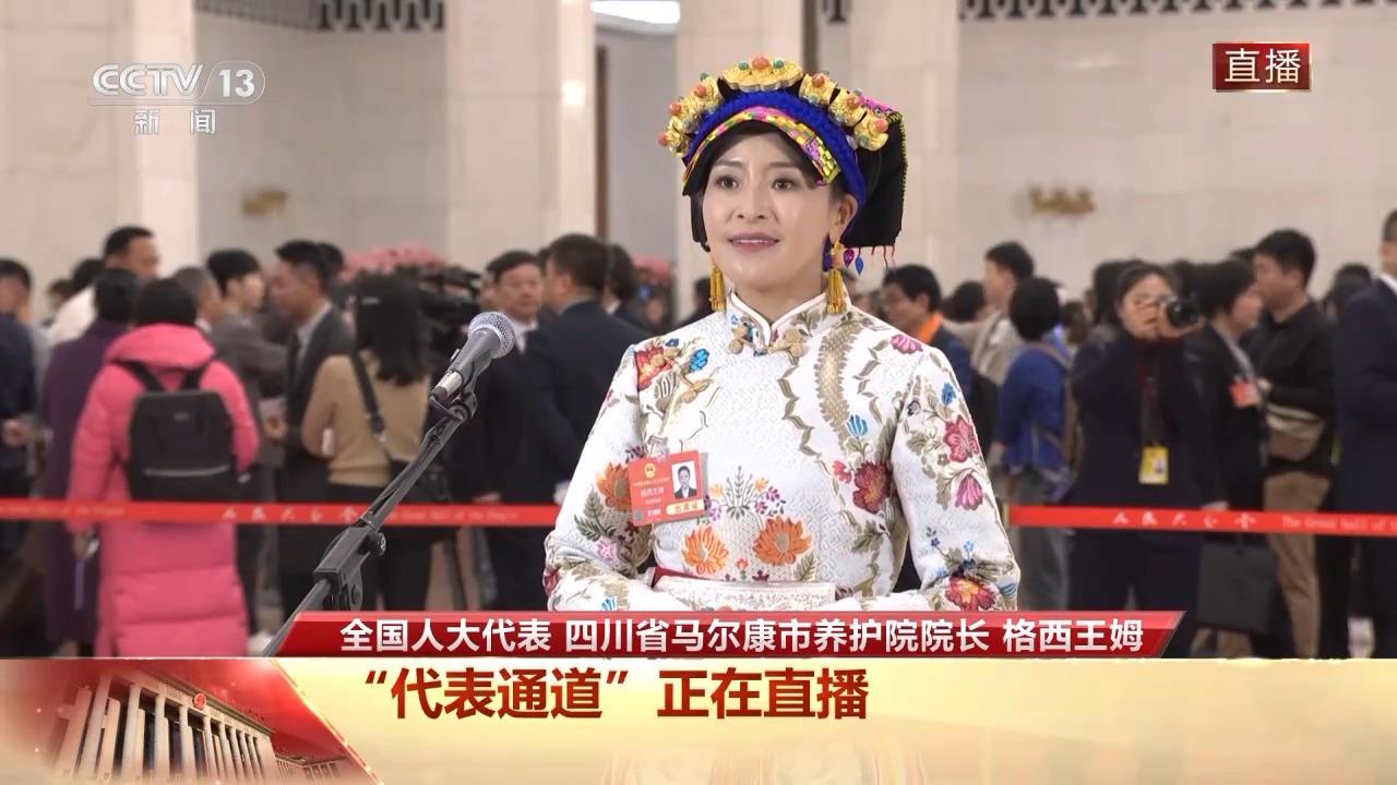 今天(3月5日),十四届全国人大三次会议首场“代表通道”在人民大会堂举行,全国人大代表、四川省马尔康市养护院院长格西王姆接受记者采访。