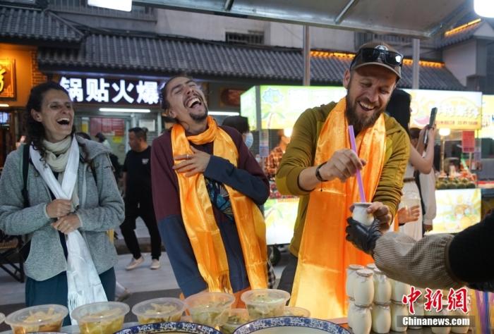 资料图:青海西宁,外国游客在大新街夜市品尝青海特色酸奶。 中新社记者 马铭言 摄