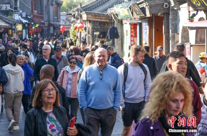 资料图:北京什刹海地区,外国游客在胡同内参观游览。 中新社记者 贾天勇 摄