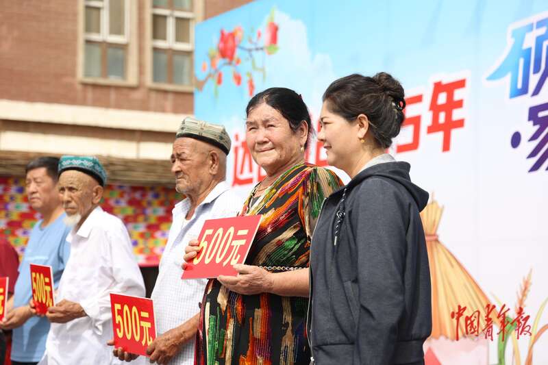 9月9日,新疆巴州尉犁县兴平镇达西村,一场庆丰收活动上,达西村党委书记夏提古丽·热合曼(右一)代表村集体向该村长者发放慰问金。通过棉花种植、文化旅游等,2024年达西村集体收入达230.55万元。中青报·中青网记者 王鑫昕/摄