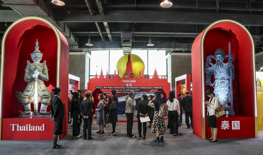 Guests visit the pavilion of Thailand, the guest of honor at the 8th Silk Road (Dunhuang) International Cultural Expo, in Dunhuang, northwest China's Gansu Province, Sept. 21, 2025. (Xinhua/Lang Bingbing)