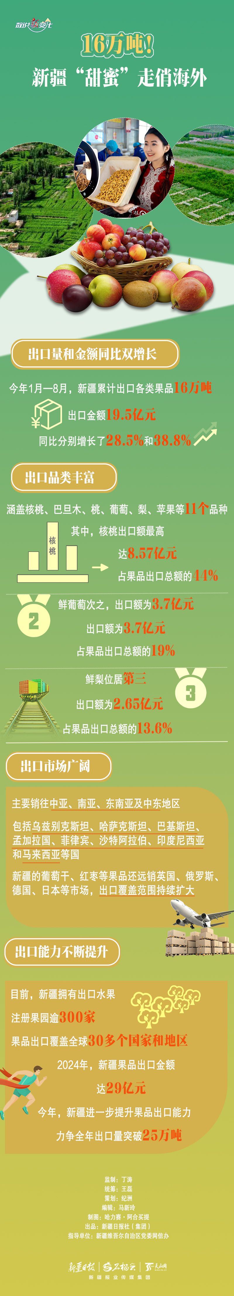 近年来,新疆持续推进林果业提质增效,果品品质显著提升,商品果率稳定在86%以上,为扩大出口奠定坚实基础。今年1月—8月,新疆果品出口快速增长,“甜蜜产业”海外走俏。哪些水果畅销海外?主要销往哪些地区和国家?今天的《“数”说新变化》一起来了解。